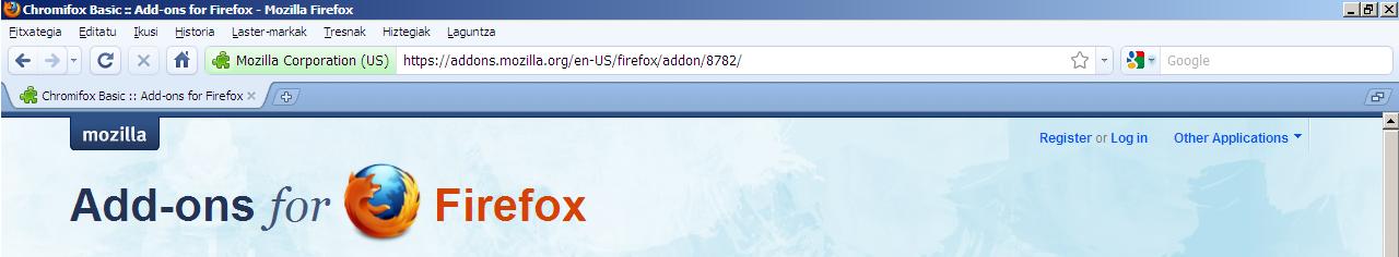 Beno, esan bezala, Chrome nabigatzailearen itxura minimalista asko gustatzen zait, baina ni Firefox erabili nahi dut, beraz honako azala aurkitu eta instalatu dut. Oso ona iruditzen zait.