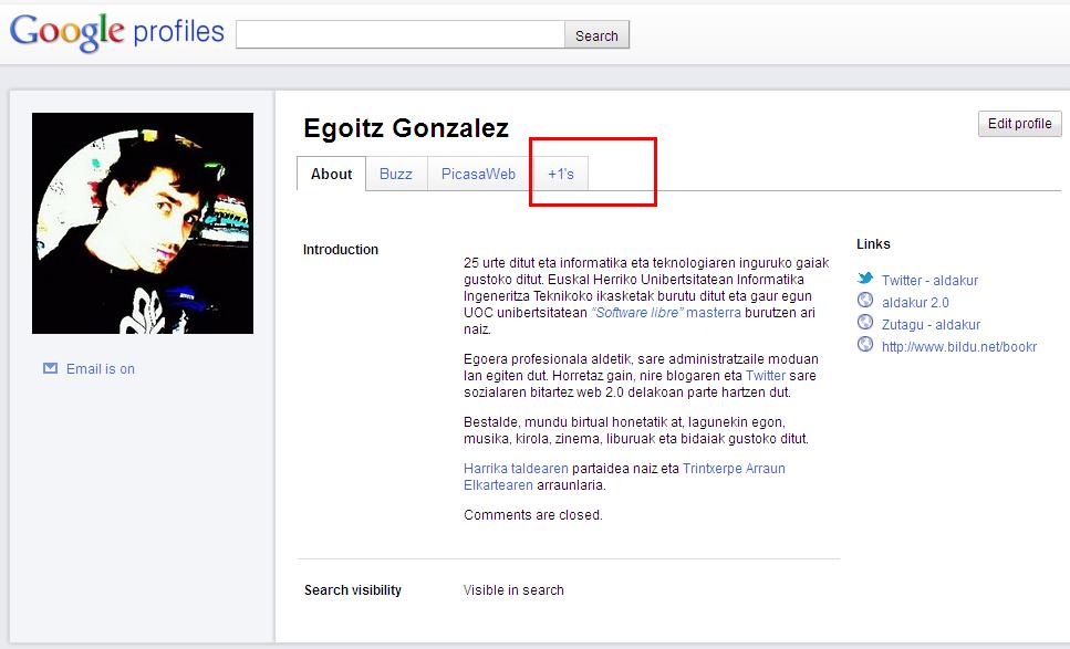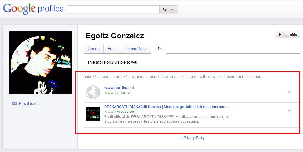 Hona hemen “harrika†hitzaren bilaketa baten emaitza, eta emaitza batzutan “+1″ aukeran klikatu ondoren nire Google profilak duen itxura berria: